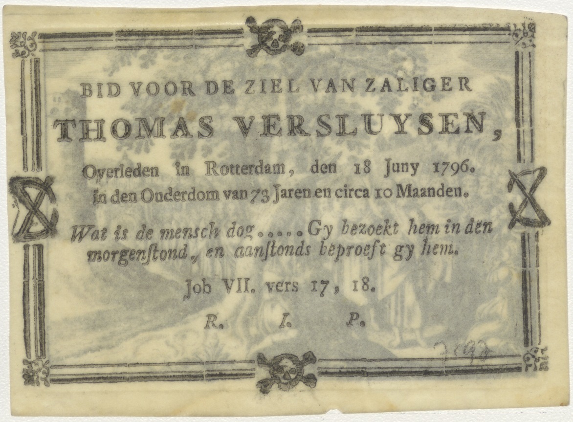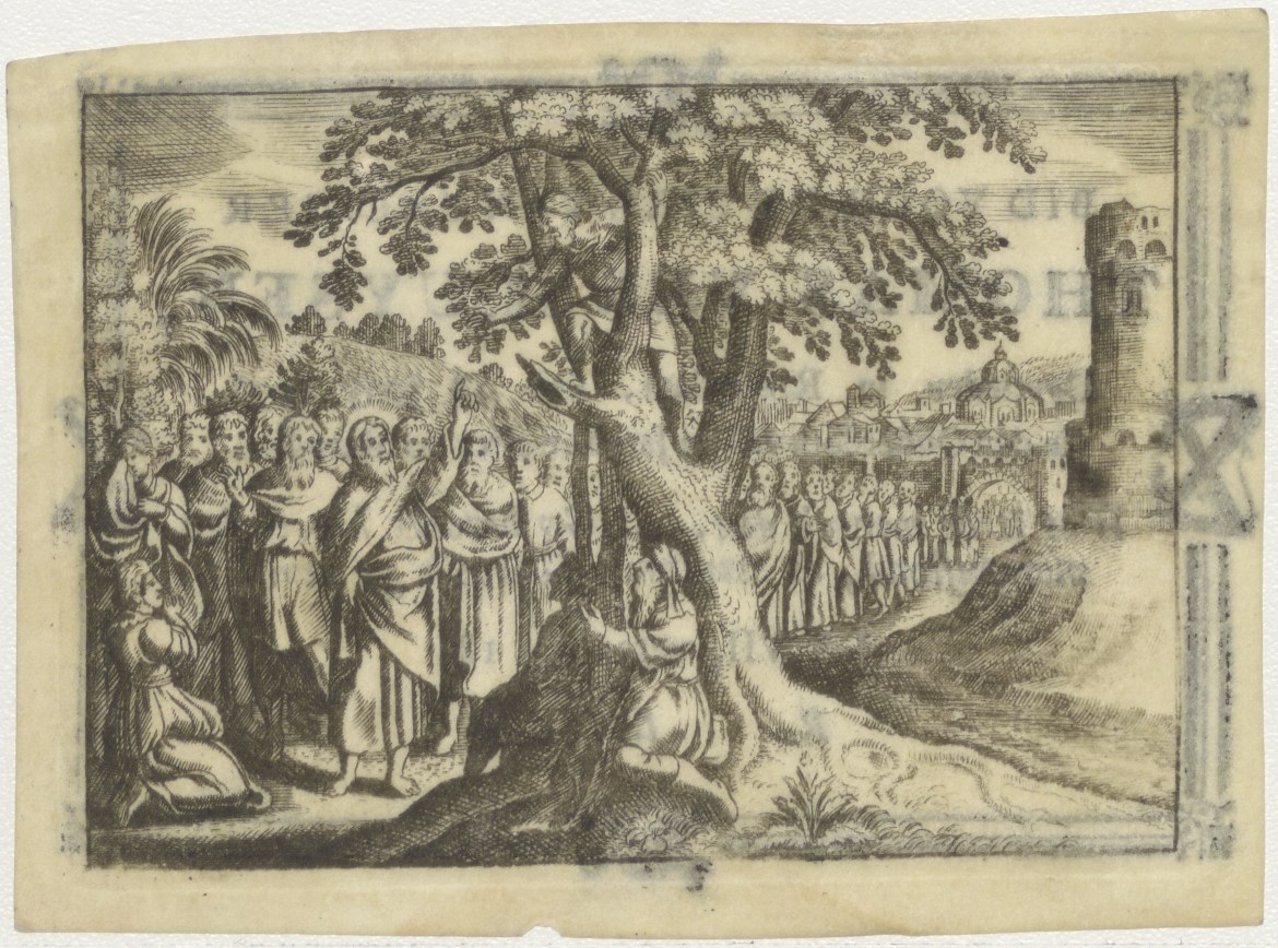 Christus predikt en wijst naar man in de boom, kz. Bid voor ziel Versluysen (+1796) Rotterdam