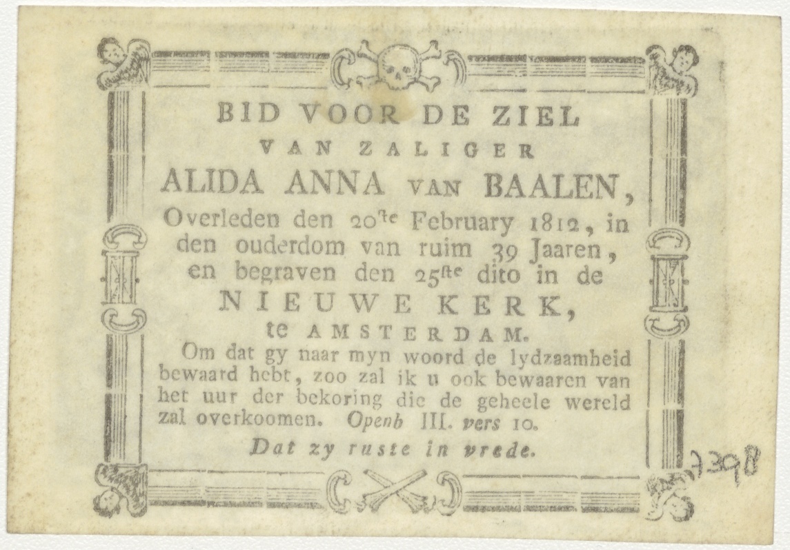 Onze Vader die in de hemel zijt..., kz. Bid voor ziel Van Baalen (+1812) Amsterdam