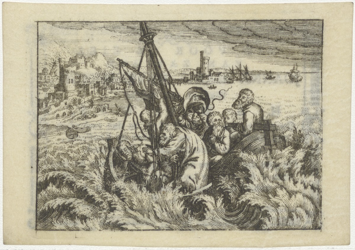 Christus slaapt in de boot tijdens de storm op het meer van Galilea, kz. Bid voor ziel Ravensbergh-de Wijs (+1813) onder de gerechte van 't Hoogeland