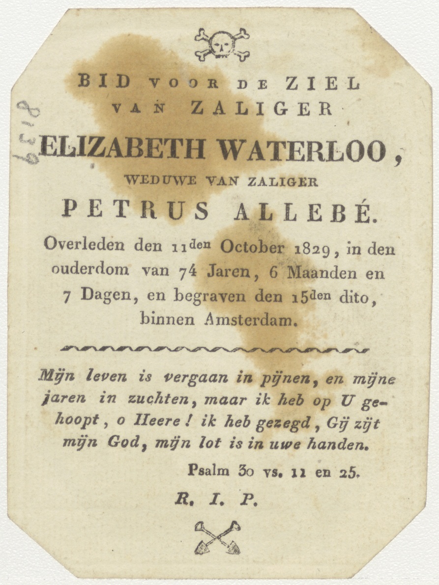 H. Aloysius van Gonzaga, kz. Bid voor ziel Allebé-Waterloo (+1829) Amsterdam