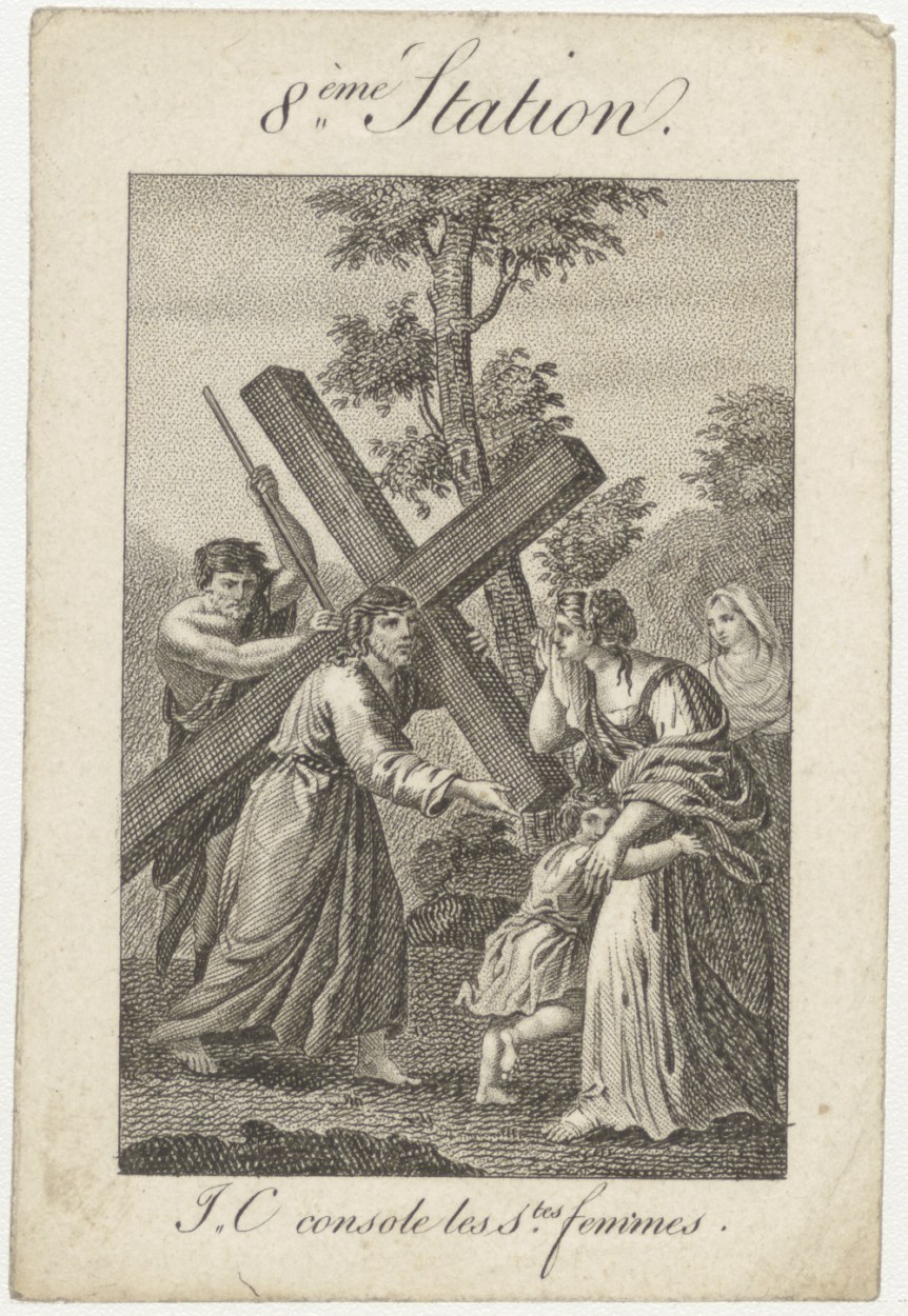 Passiescène (8e statie) Christus ontmoet de vrouwen van Jeruzalem (Frans), kz. Religieus; bid voor ziel Johannes Schierling (+1829) pastoor te Bemmel