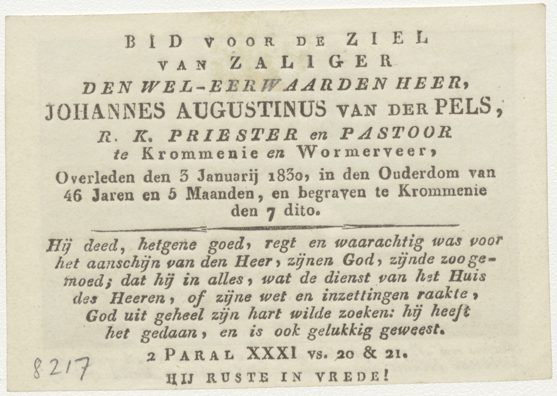 Petrus een stater uit den mond van den visch gekrege hebbende ... (Math. 17:29), kz. Religieus; bid voor ziel Johannes Augustinus van der Pels (+1830) Krommenie, pastoor te Krommenie, Wormerveer