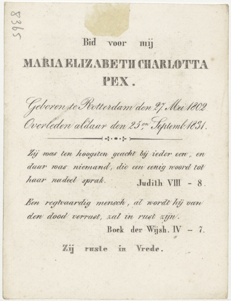 Gebroken zuil, met zandloper (Frans), kz. Bid voor ziel Pex (+1831) Rotterdam