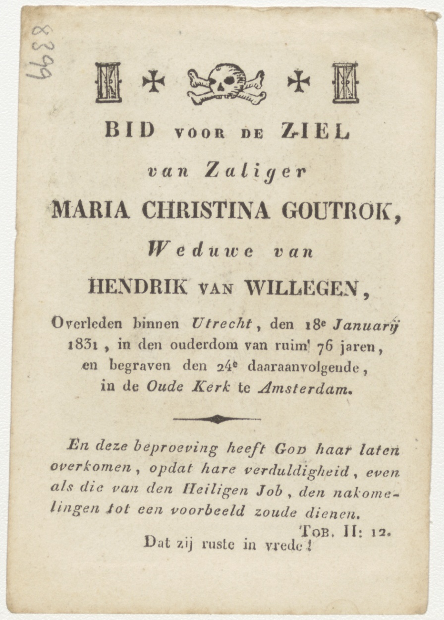 H. Ambroise (Frans), kz. Bid voor ziel Maria Christina Goutrok (+1831) Utrecht, weduwe van Hendrik van Willigen