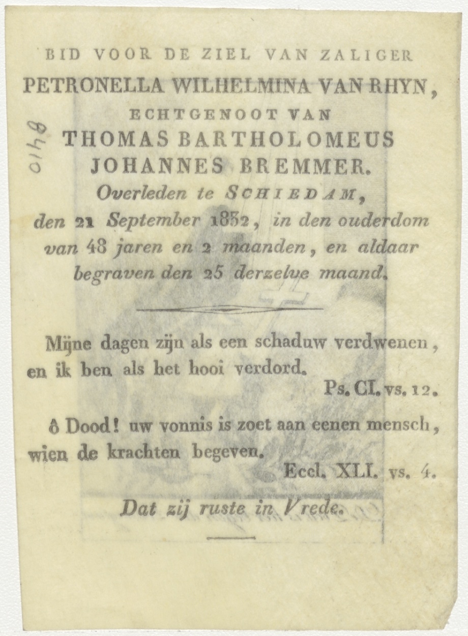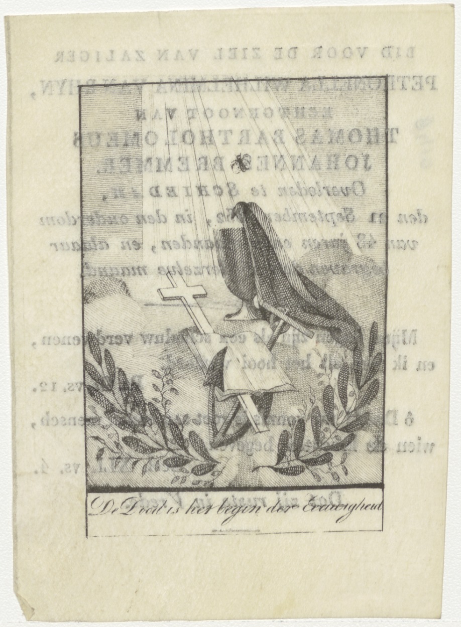 De dood is het begin der eeuwigheid, met kruis, anker en boek, kz. Bid voor ziel Petronella Wilhelmina van Rhijn (+1832) Schiedam, echtgenoot van Thomas Bartholomeus Johannes Bremmer