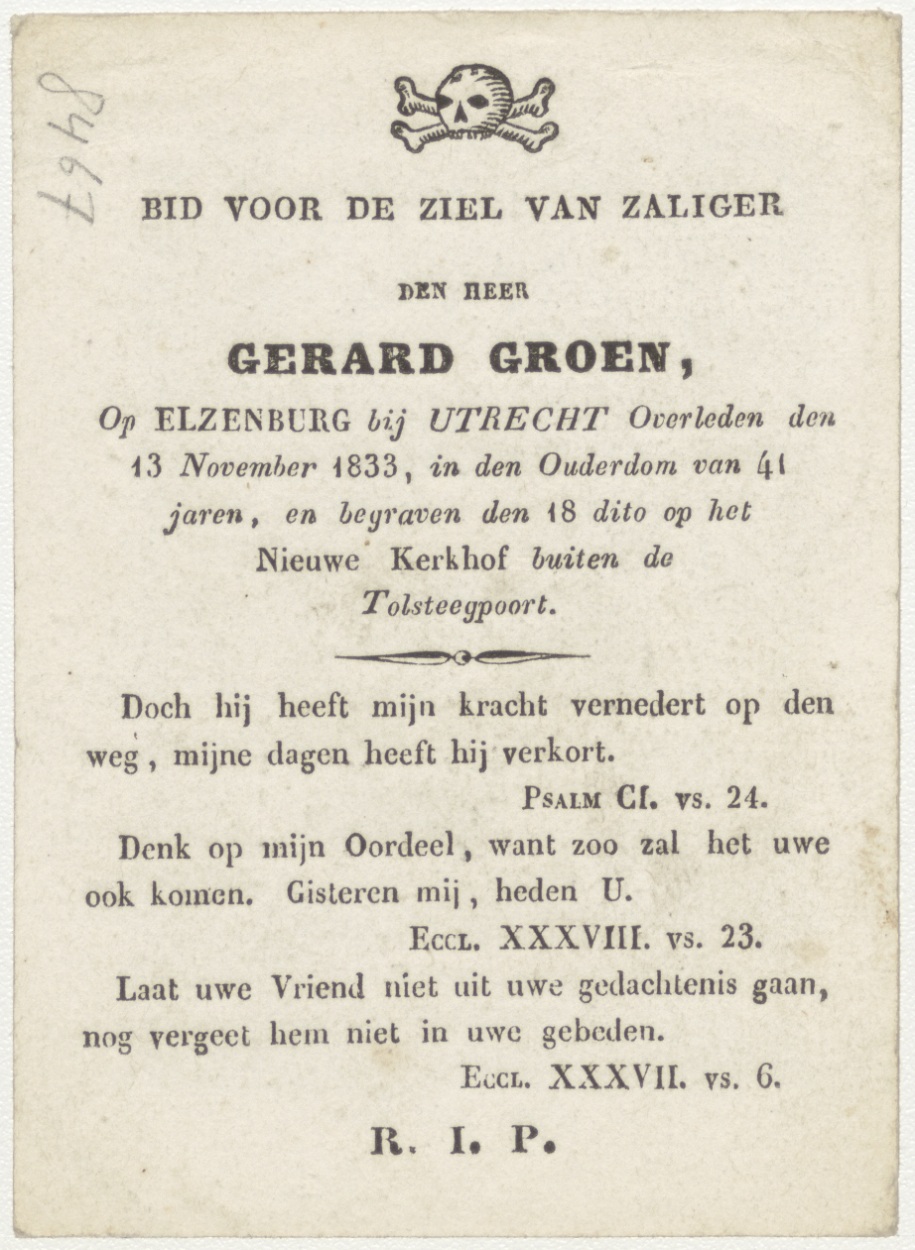 Kruis, draag het kruis van Christus (Frans), kz. Bid voor ziel Groen (+1833) Elzenburg bij Utrecht