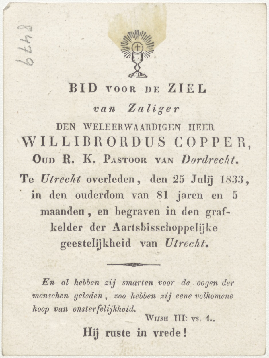 Heer ontferm u over mij (Frans), kz. Religieus; bid voor ziel Willibrordus Copper (+1833) pastoor te Dordrecht
