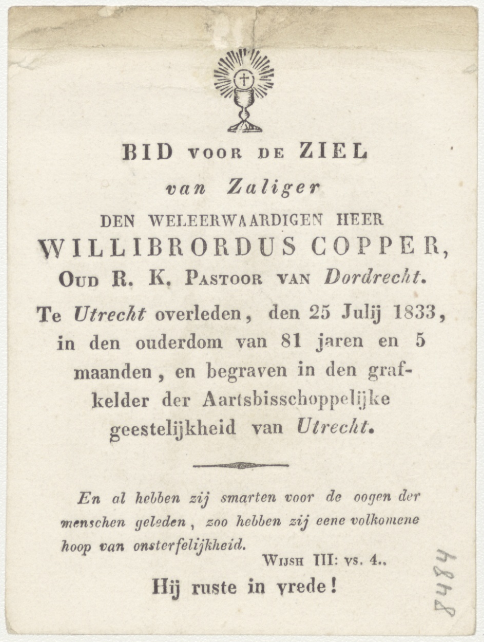 H. Elisabeth (Frans), kz. Religieus; bid voor ziel Willibrordus Copper (+1833) pastoor te Dordrecht