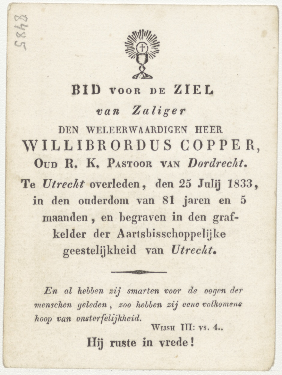 H. Bruno (Frans), kz. Religieus; bid voor ziel Willibrordus Copper (+1833) pastoor te Dordrecht