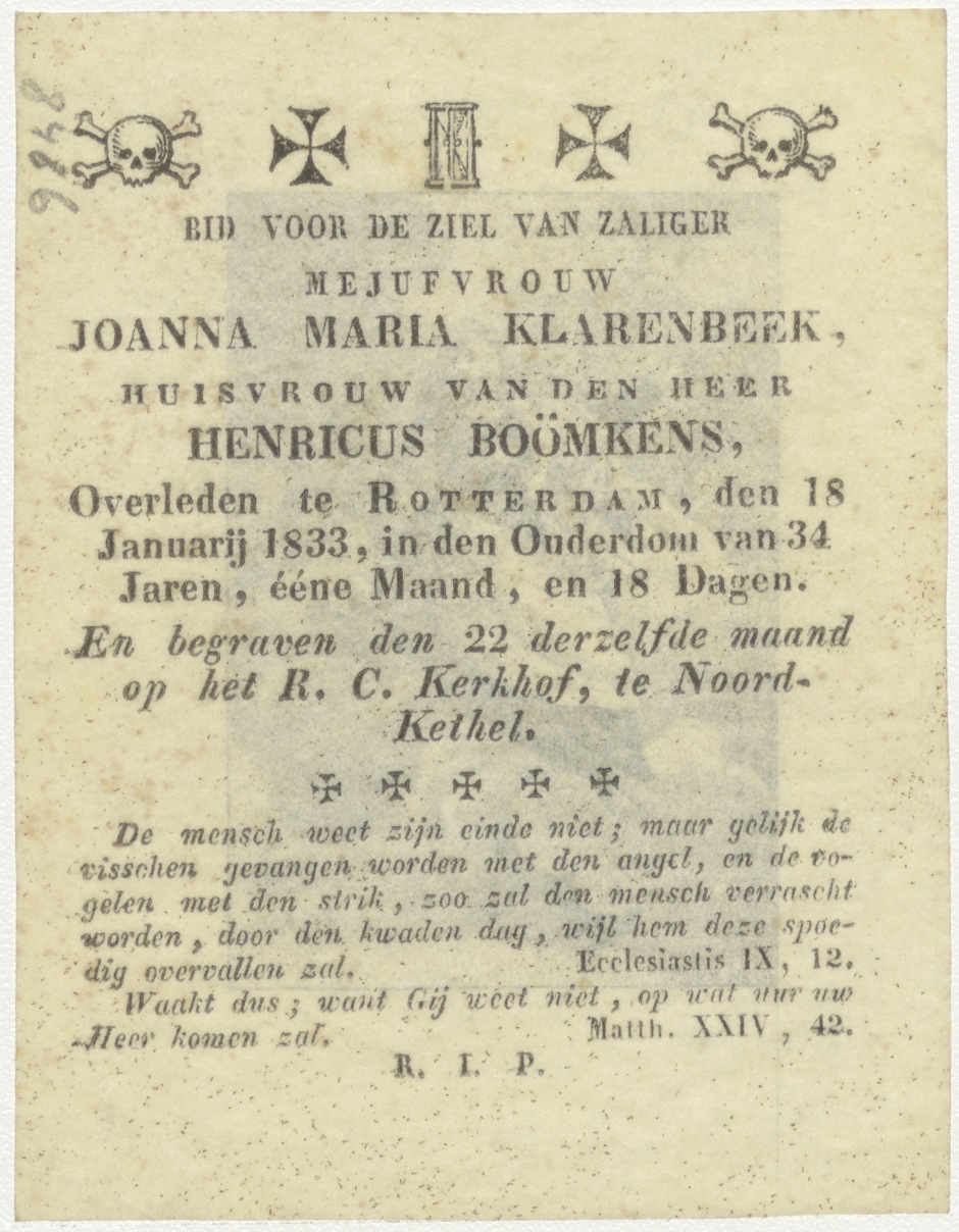 Hemelvaart van Maria, kz. Bid voor ziel Klarenbeek-Boomkens (+1833) Rotterdam