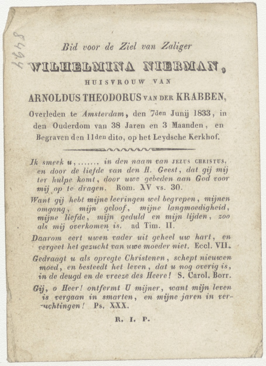 H. Johannes de Doper (Frans), kz. Bid voor ziel Nierman-van der Krabben (+1833) Amsterdam