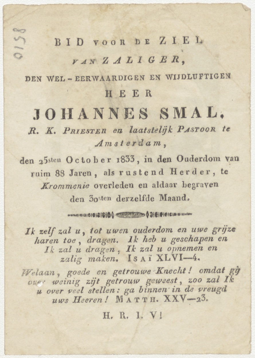 H. Petrus, apostel, kz. Religieus; bid voor ziel Johannes Smal (+1833) pastoor te Amsterdam