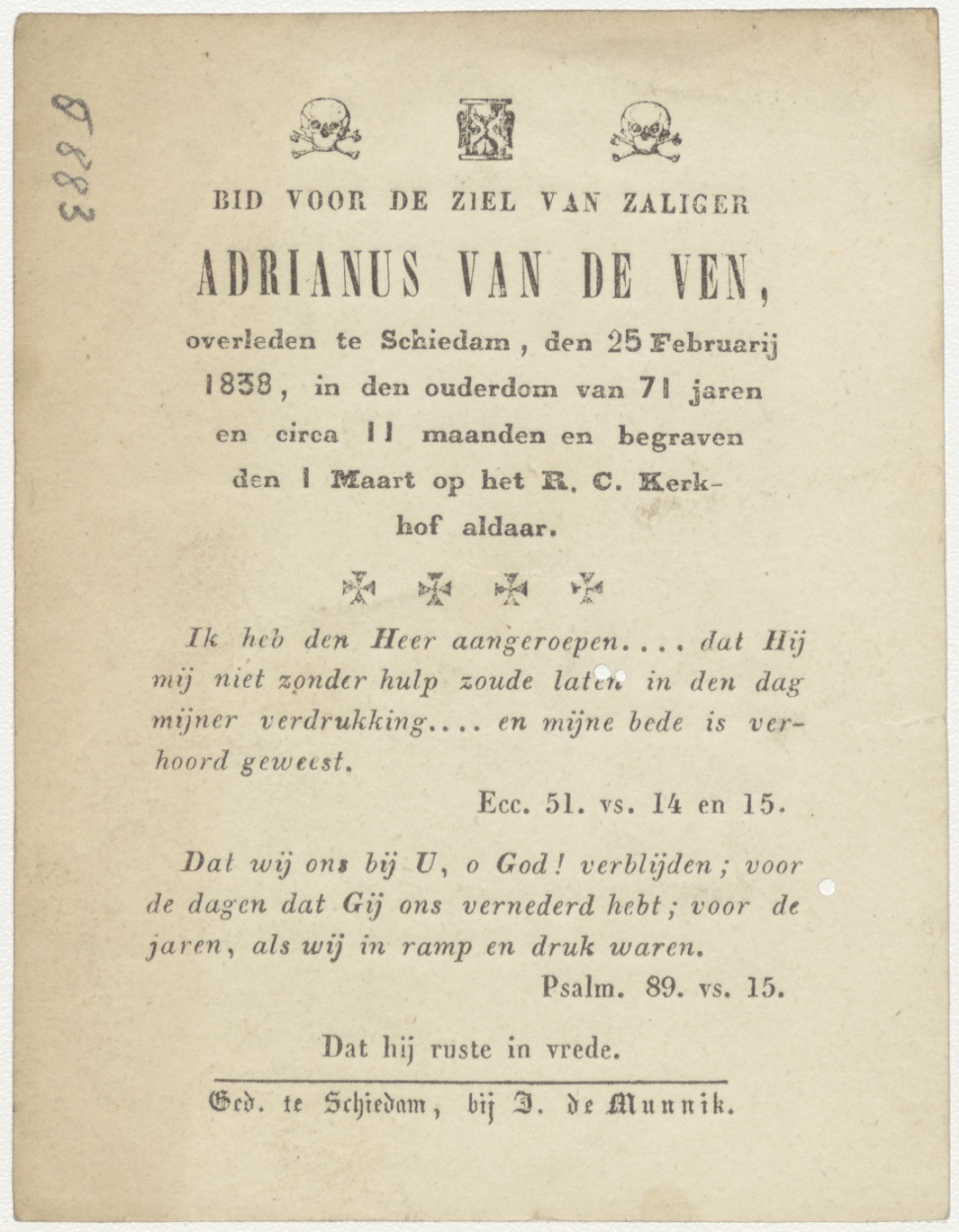 Schedel, gedenkt te sterven, kz. Bid voor ziel Van de Ven (+1838) Schiedam