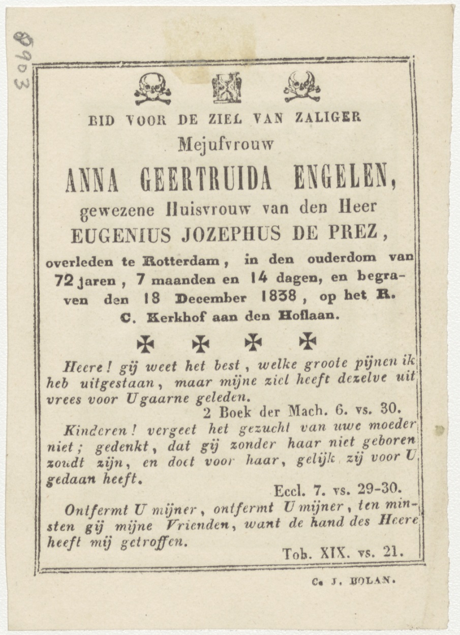H. Maagd Maria, kz. Bid voor ziel De Prez-Engelen (+1838) Rotterdam