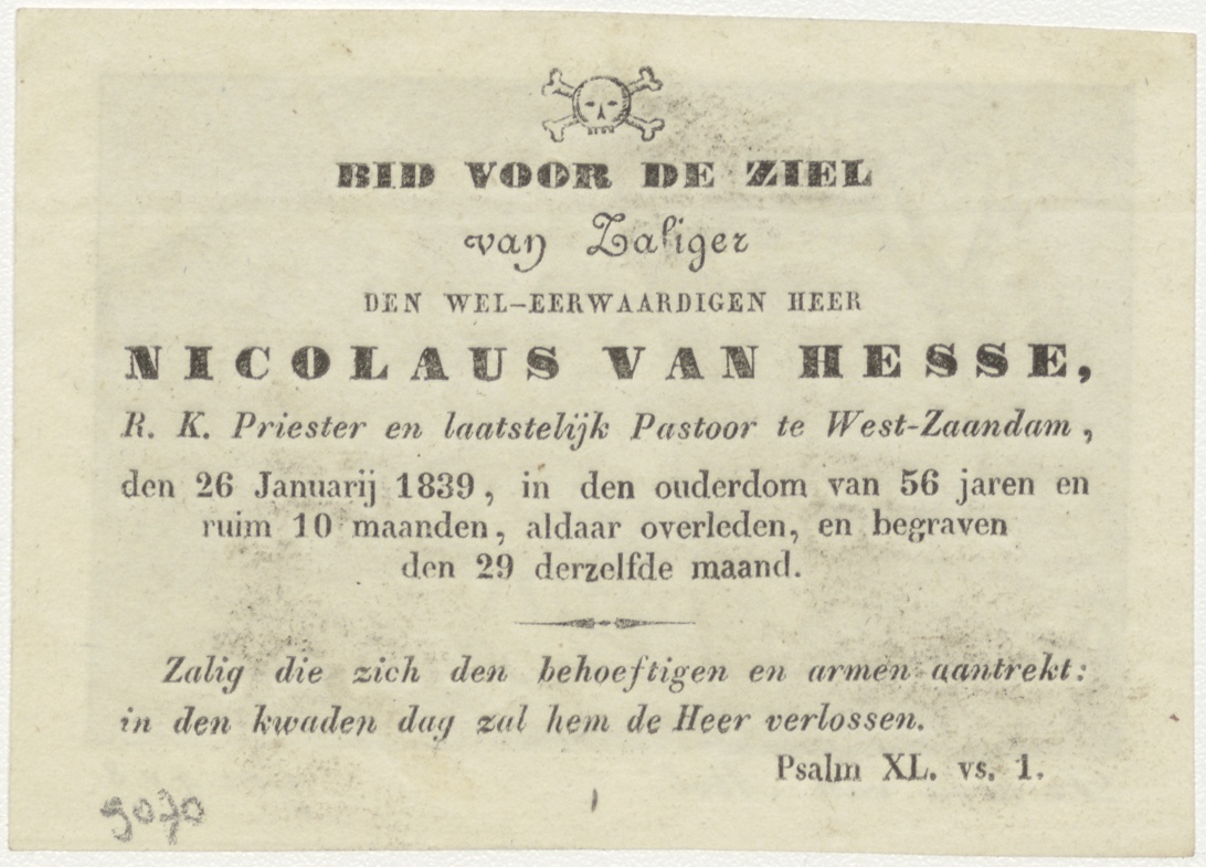Dood van Abel, kz. Religieus; bid voor ziel Nicolaas van Hesse (+1839) pastoor te West-Zaandam