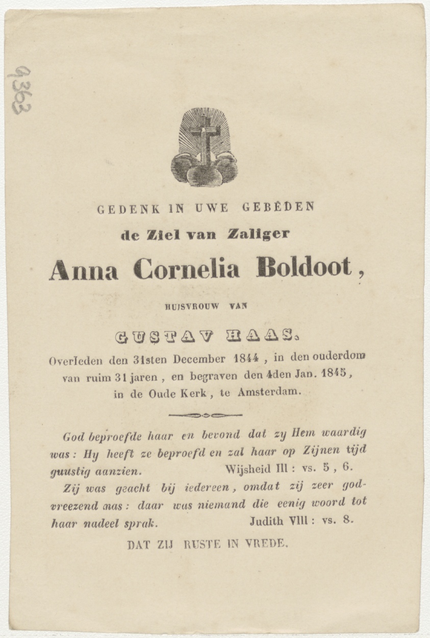Verrijzenis van Christus (Frans), kz. Bid voor ziel Anna Cornelia Boldoot (+1844) Amsterdam, huisvrouw van Gustav Haas