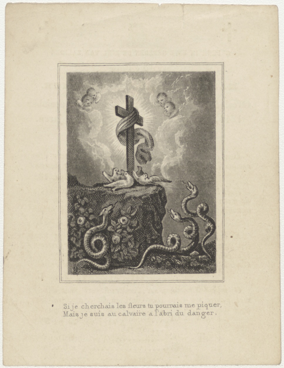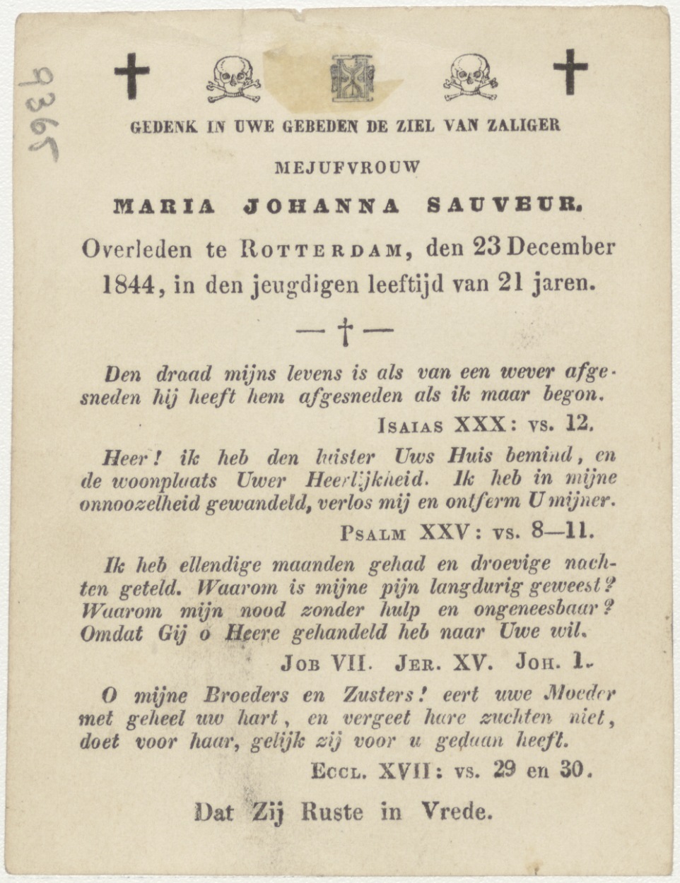 Kruis met duiven en slangen (Frans), kz. Bid voor ziel Sauveur (+1844) Rotterdam