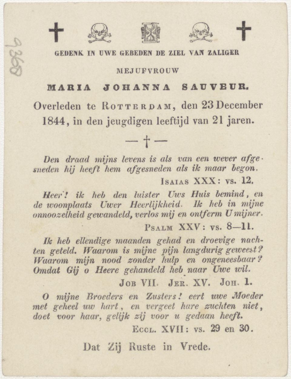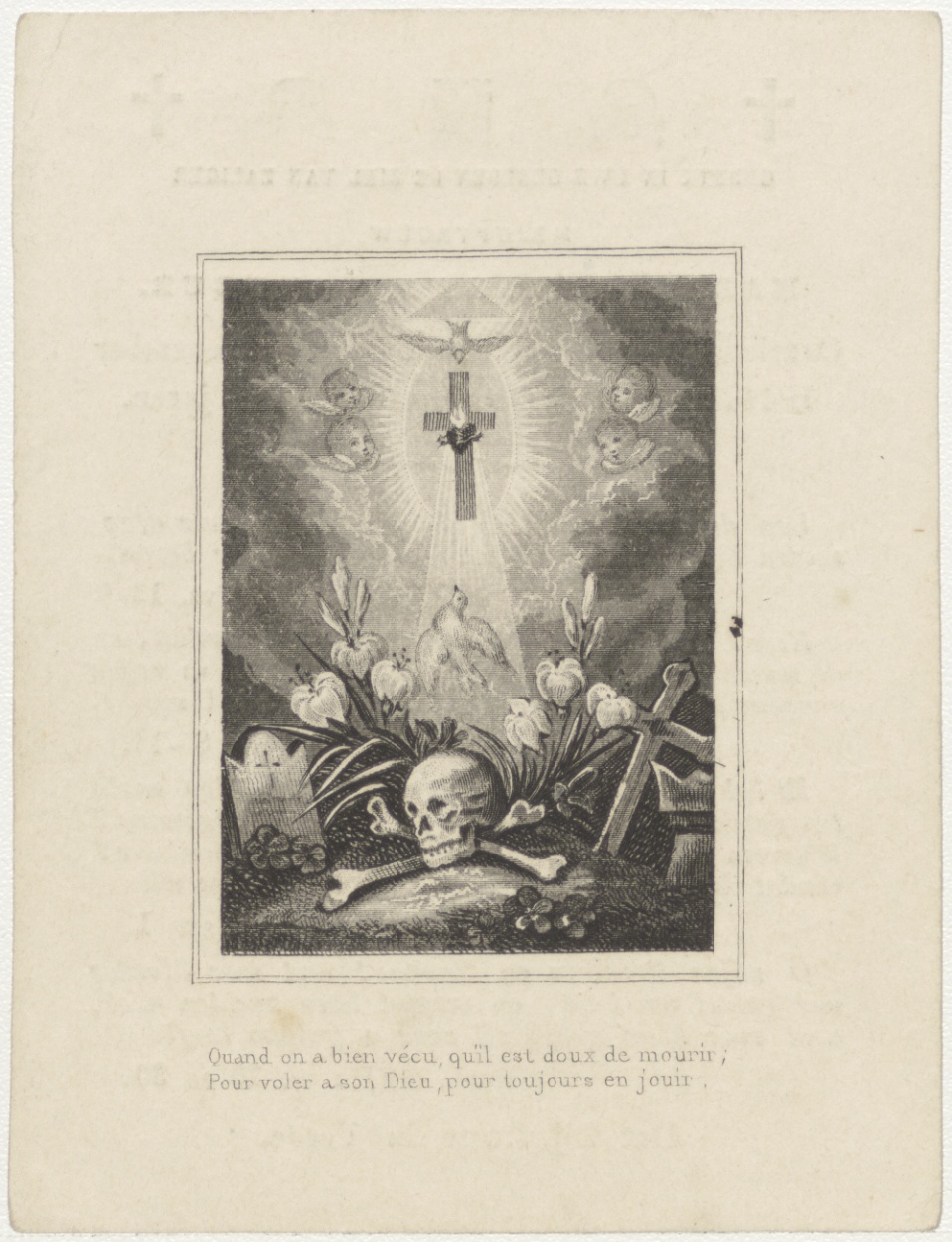 Kerkhof met kruis en H. Geest (Frans), kz. Bid voor ziel Sauveur (+1844) Rotterdam