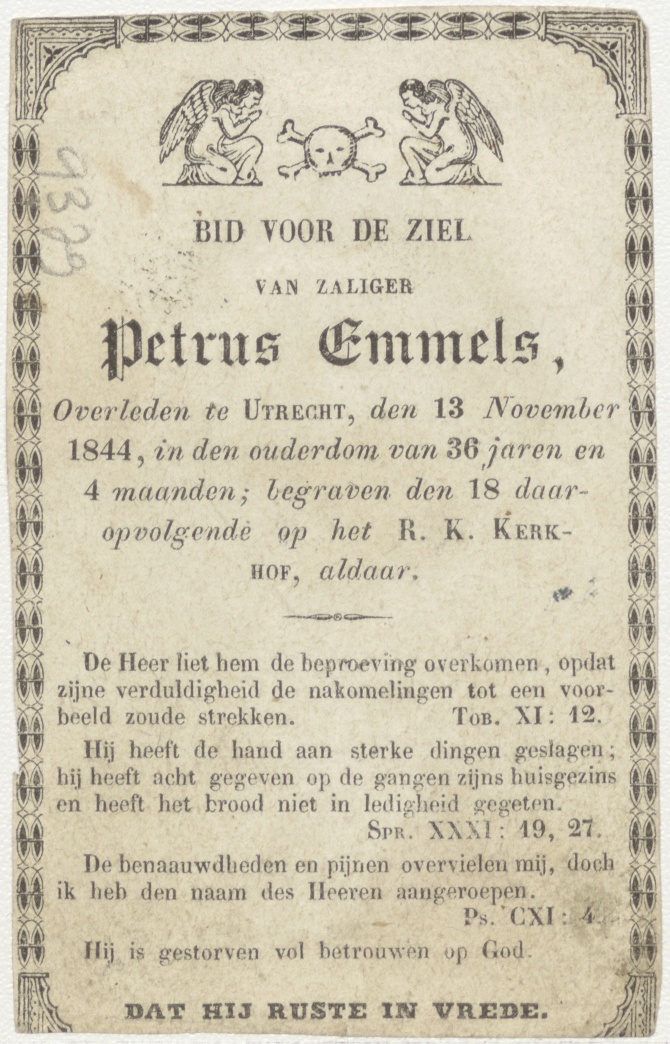Heilige, engel verlost hem uit gevangenis, kz. Bid voor ziel Emmels (+1844) Utrecht