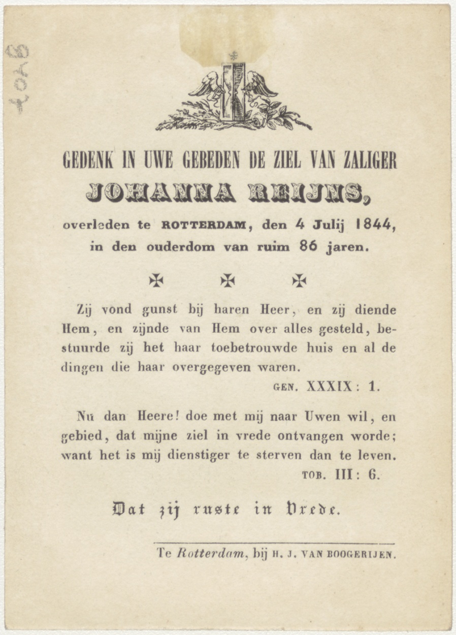 H. Francisca (Frans), kz. Bid voor ziel Reijns (+1844) Rotterdam
