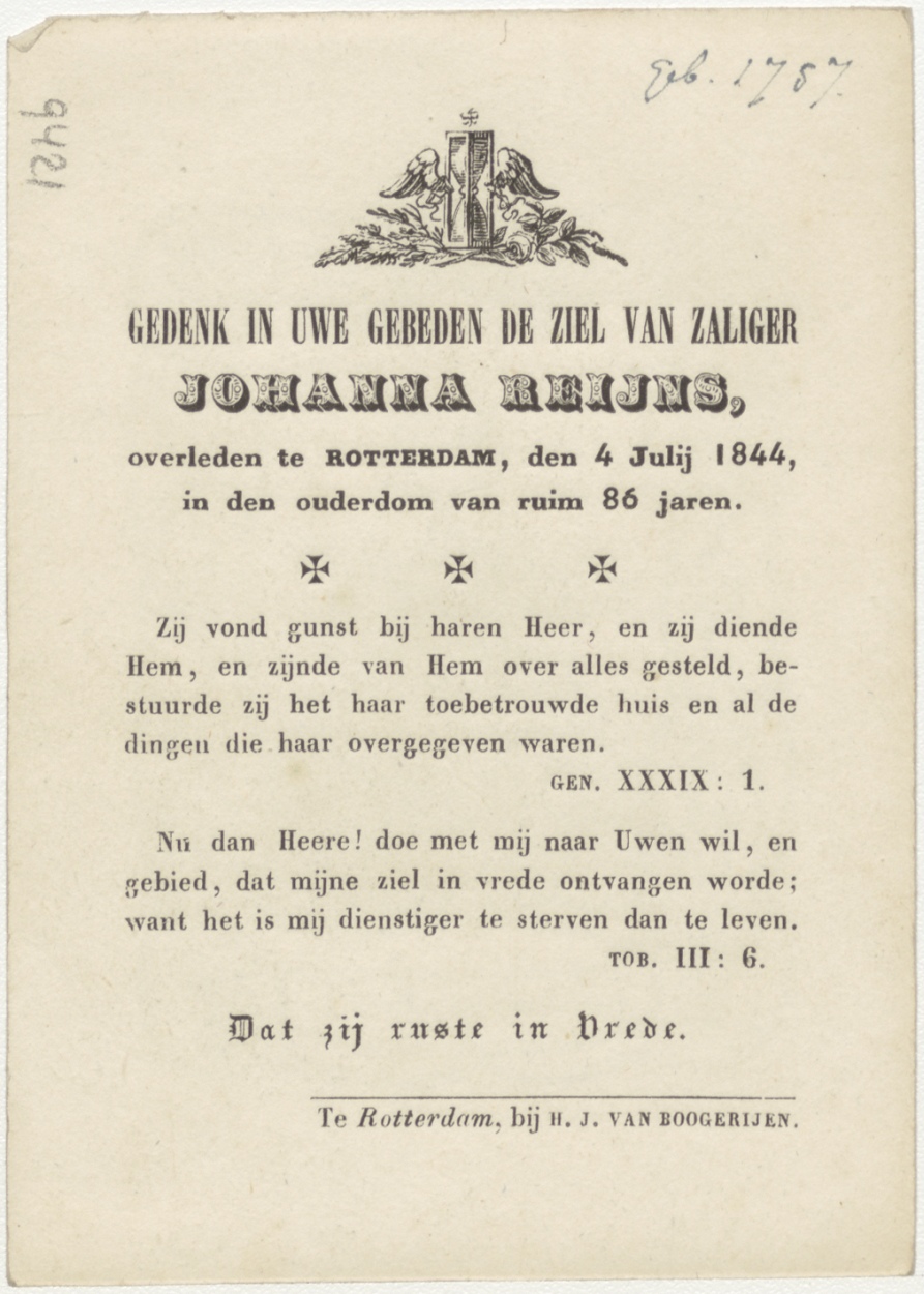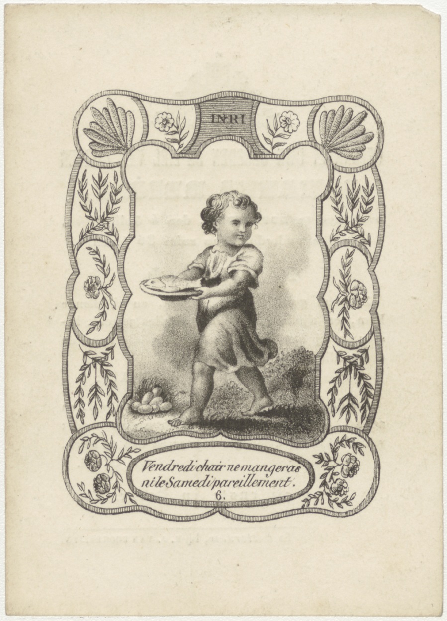 Vrijdag visdag, kind met visschotel (Frans), kz. Bid voor ziel Reijns (+1844) Rotterdam