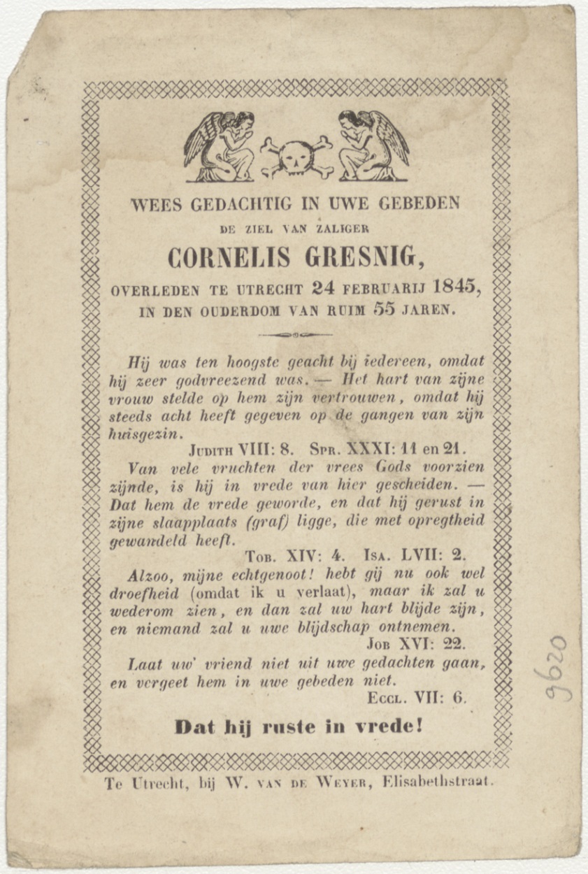 Voorstelling in de tempel, kz. Bid voor ziel Gresnig (+1845) Utrecht