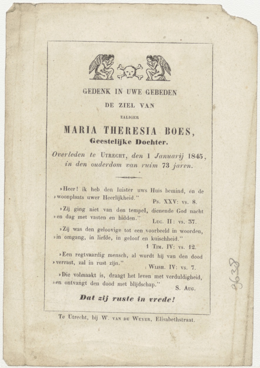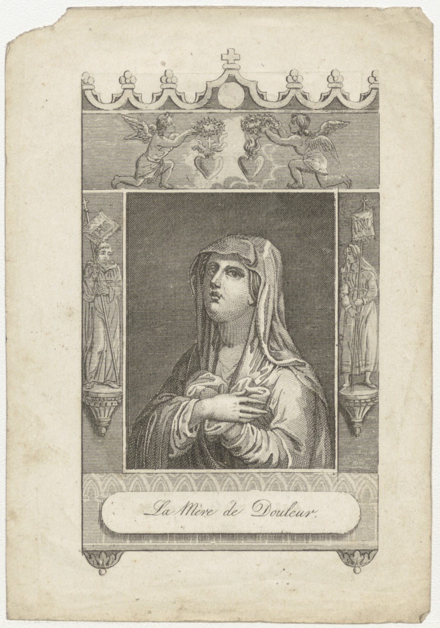 Maria, moeder der smarten (Frans), kz. Religieus; bid voor ziel Maria Boes (+1845) geestelijk dochter Utrecht