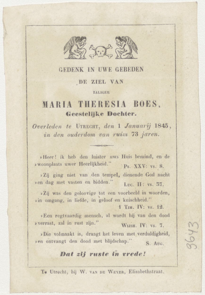 Passiescène (4e statie): Christus ontmoet zijn moeder (Frans), kz. Religieus; bid voor ziel Maria Boes (+1845) geestelijk dochter Utrecht