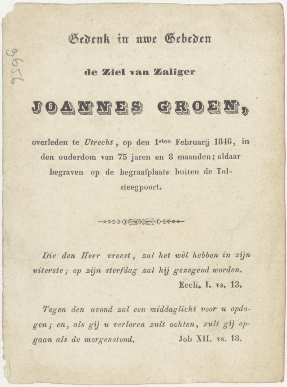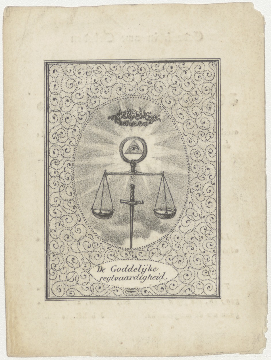 Goddelijke rechtvaardigheid, weegschaal met Gods oog, kz. Bid voor ziel Groen (+1846) Utrecht