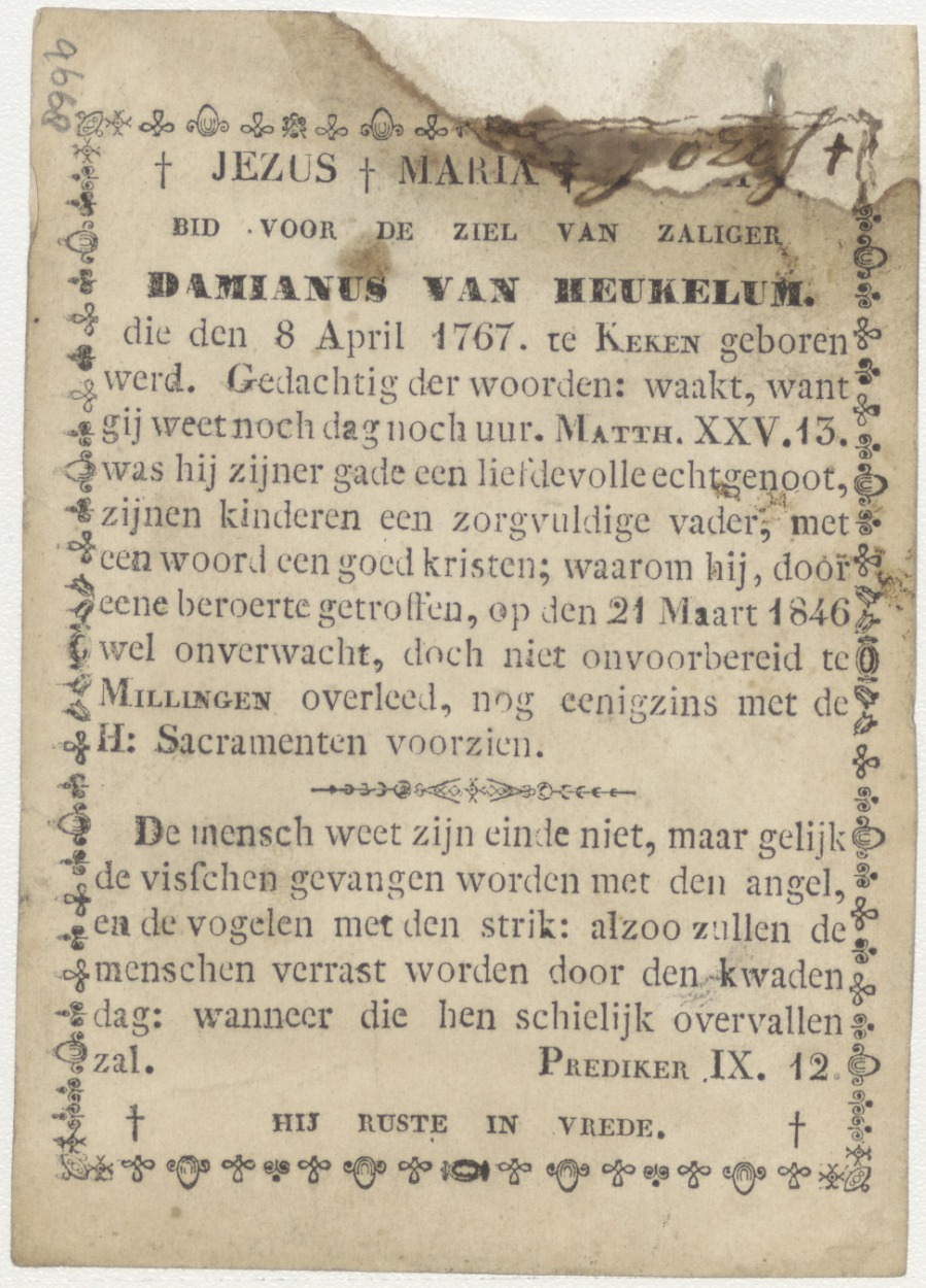 Het is vastgesteld dat wij alle eens zullen sterven... (Hebr.9) man bij graf, kz. Bid voor ziel Van Heukelum (+1846) Millingen