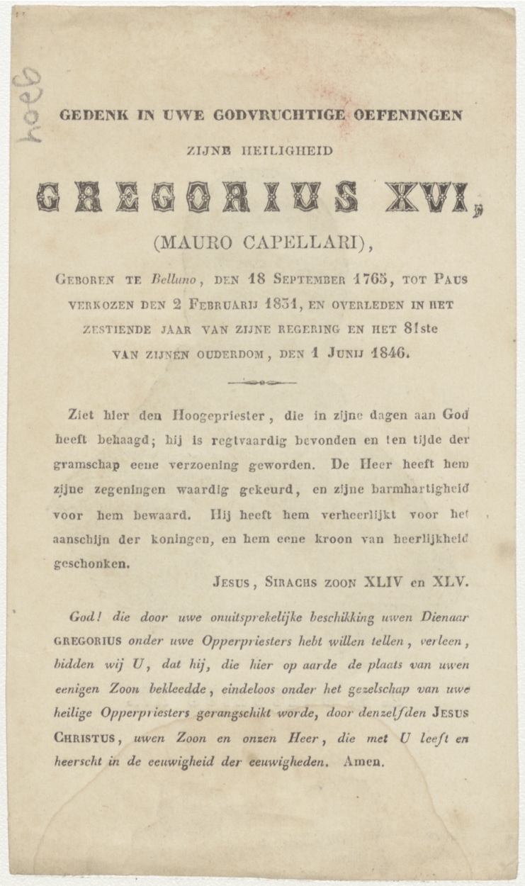 Z.H. Gregorius XVI, paus, kz. Religieus; bid voor ziel Gregorius XVI (+1846) paus