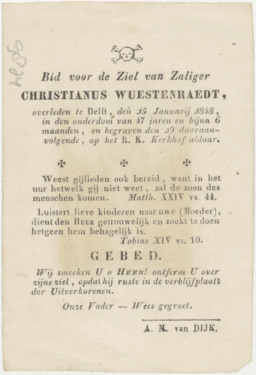 H. Ernest (Frans), kz. Bid voor ziel Wuestenraedt (+1848) Delft