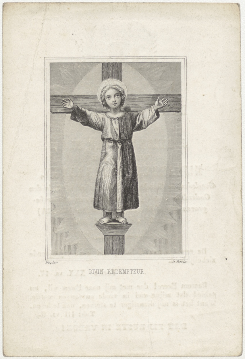 Christuskind aan het kruis (Frans), kz. Bid voor ziel Van der Bijl-Bodegraven (+1848) Gouda