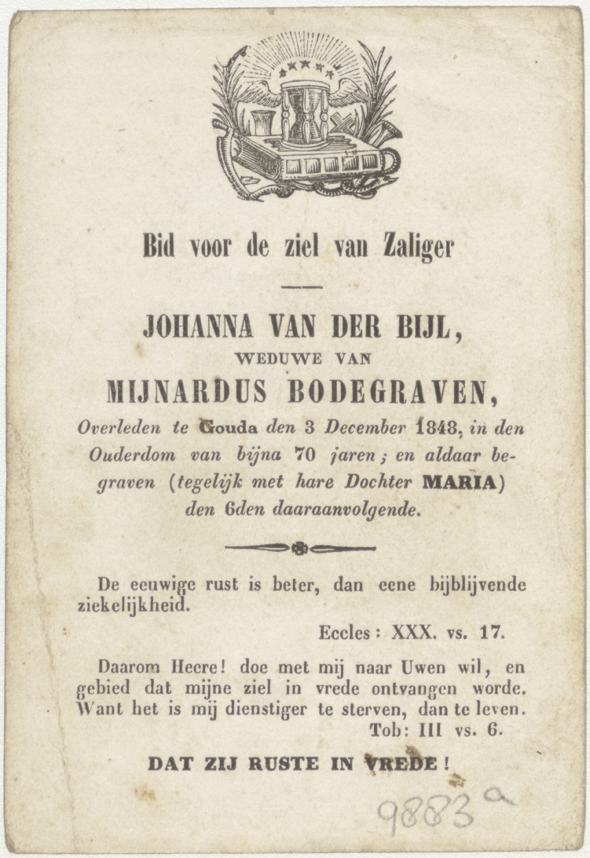 Maria, Elisabeth met Christuskind en Johannes (Frans), kz. Bid voor ziel Van der Bijl-Bodegraven (+1848) Gouda