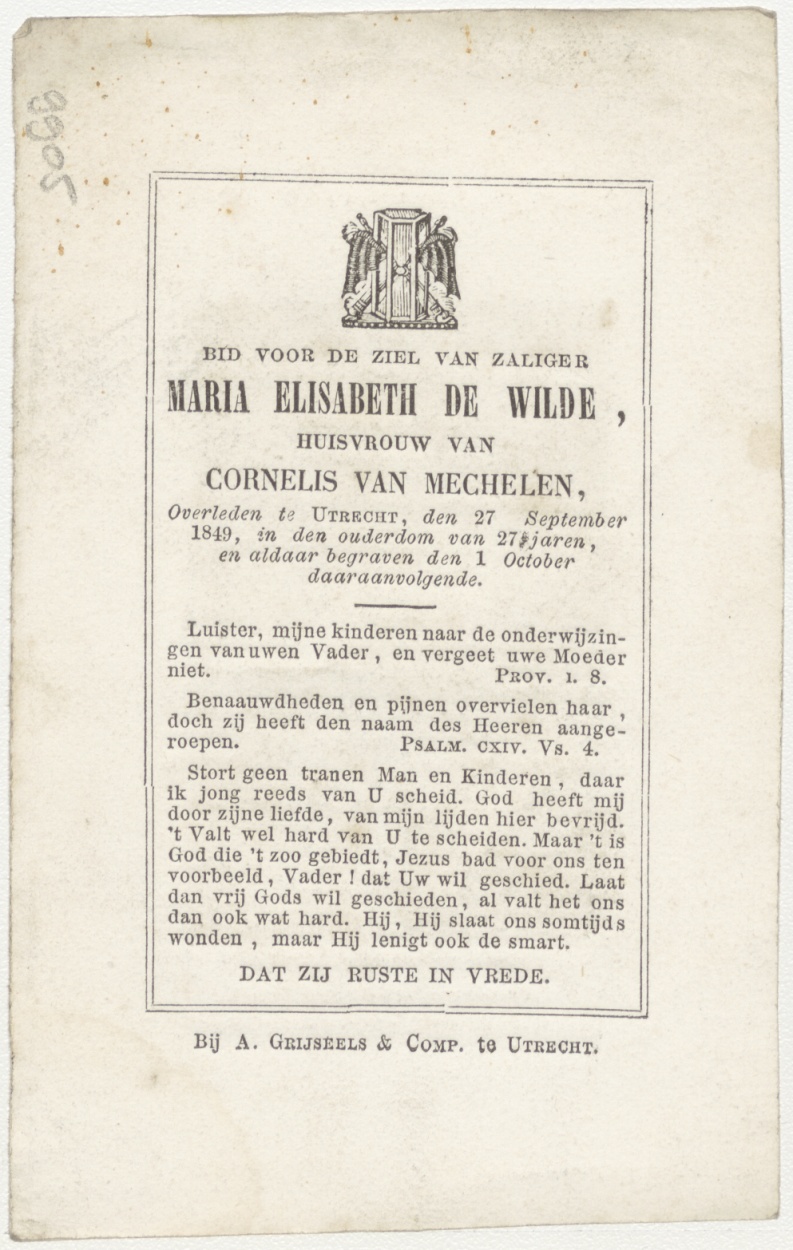 Sacrament H. Vormsel (Frans), kz. Bid voor ziel De Wilde-van Mechelen (+1849) Utrecht