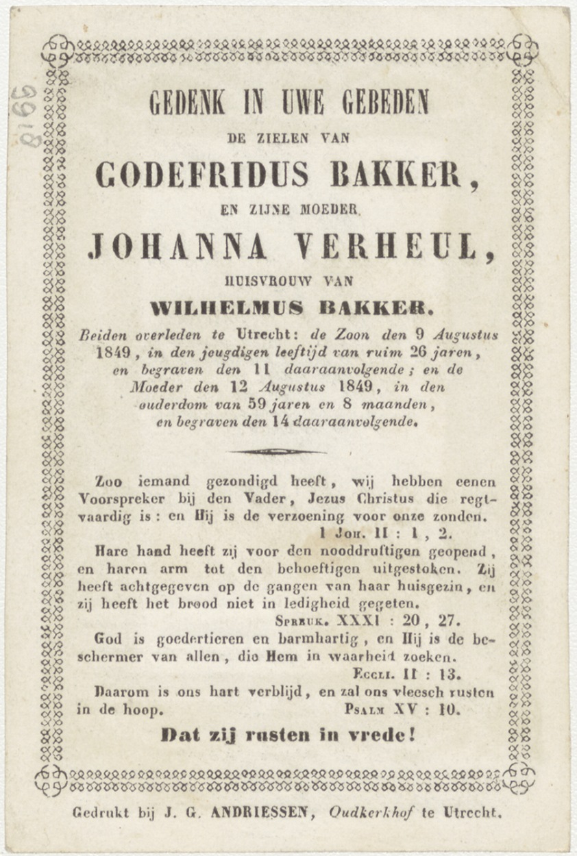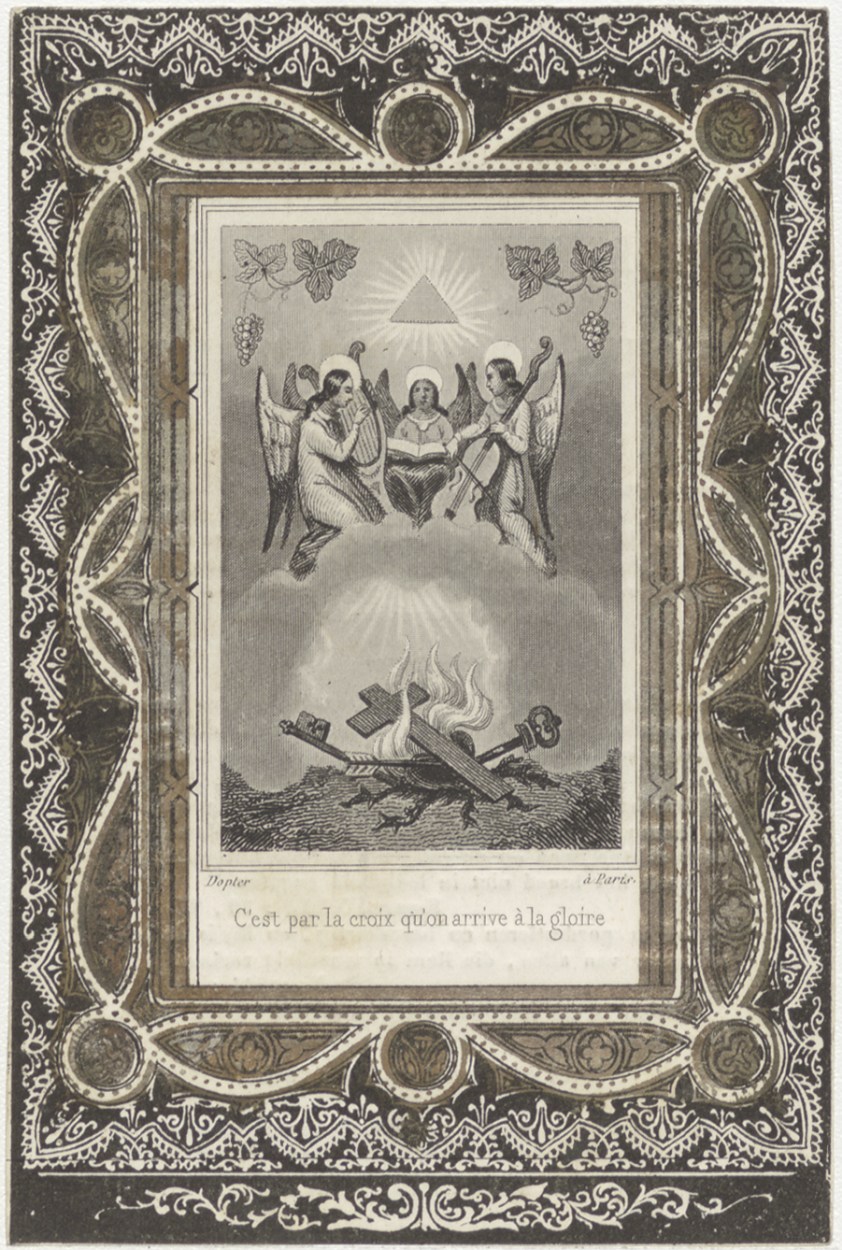 Door het kruis begon de glorie, met engelen (Frans), kz. Bid voor ziel Verheul-Bakker (+1849) Utrecht