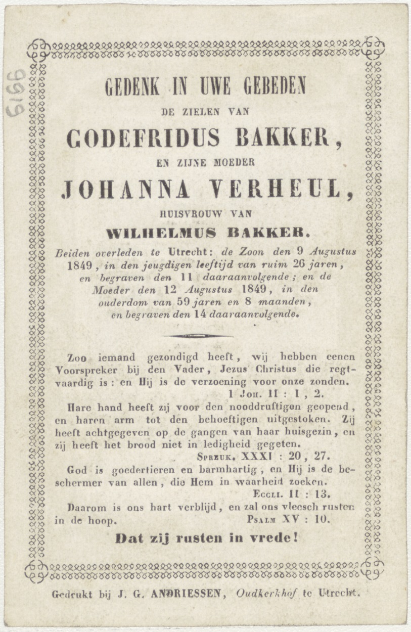 H. Rosa (Frans), kz. Bid voor ziel Verheul-Bakker (+1849) Utrecht