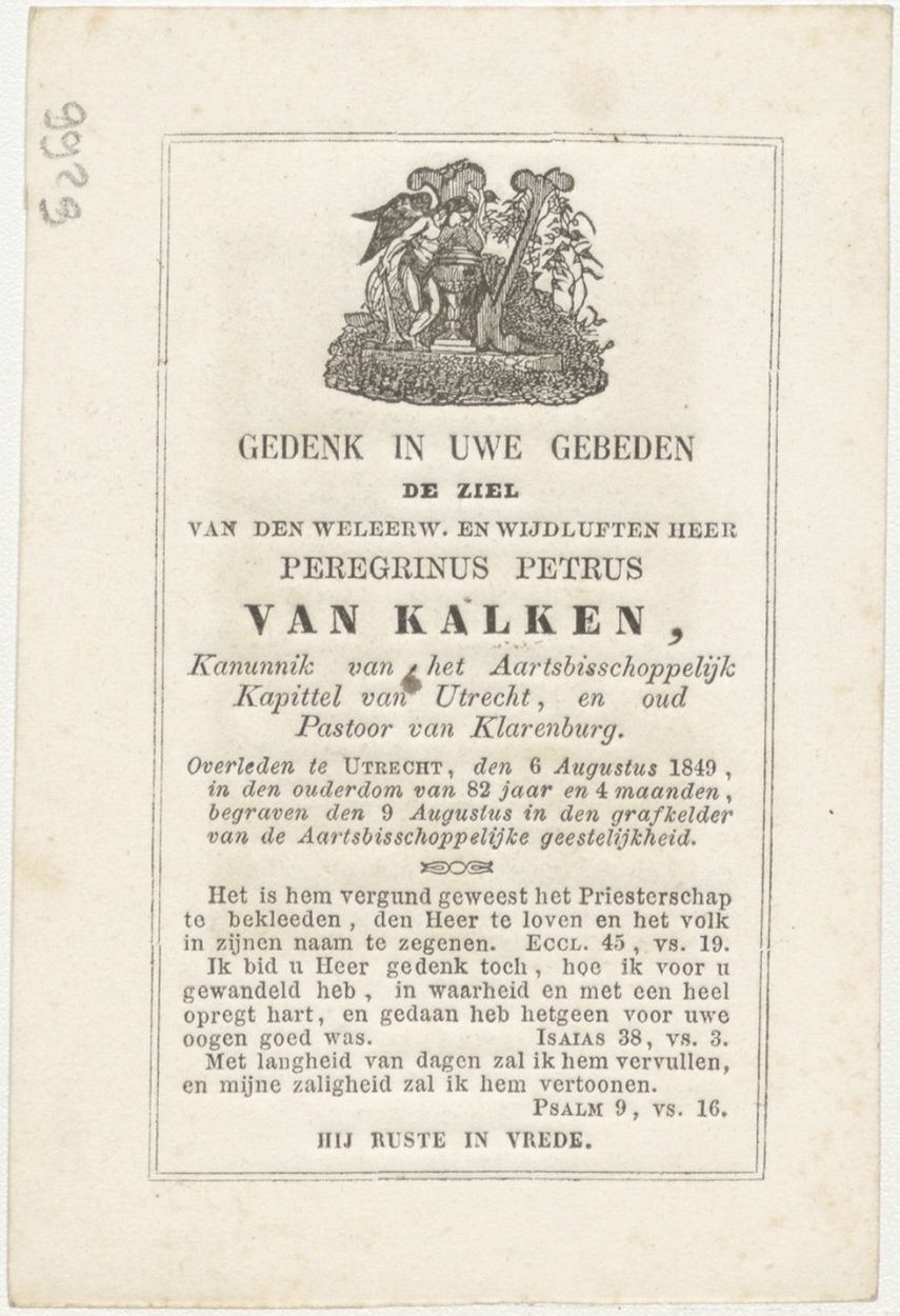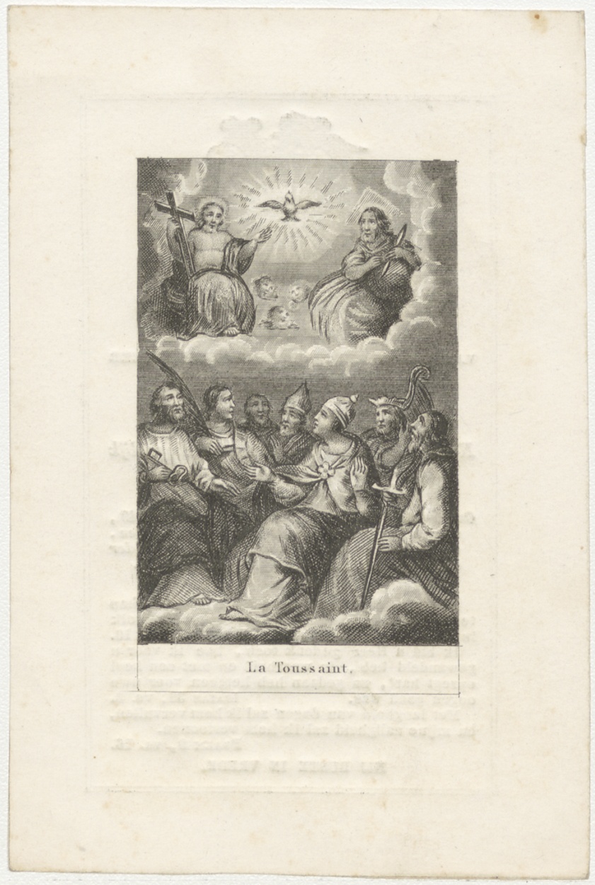 H. Drie-eenheid met heiligen (Frans), kz. Religieus; bid voor ziel Peregrinus van Kalken (+1849) kanunnik Utrecht, pastoor Klarenburg