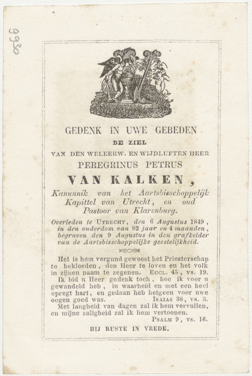 Annunciatie (Frans), kz. Religieus; bid voor ziel Peregrinus van Kalken (+1849) kanunnik Utrecht, pastoor Klarenburg