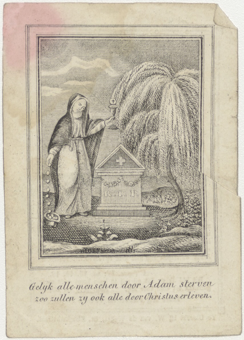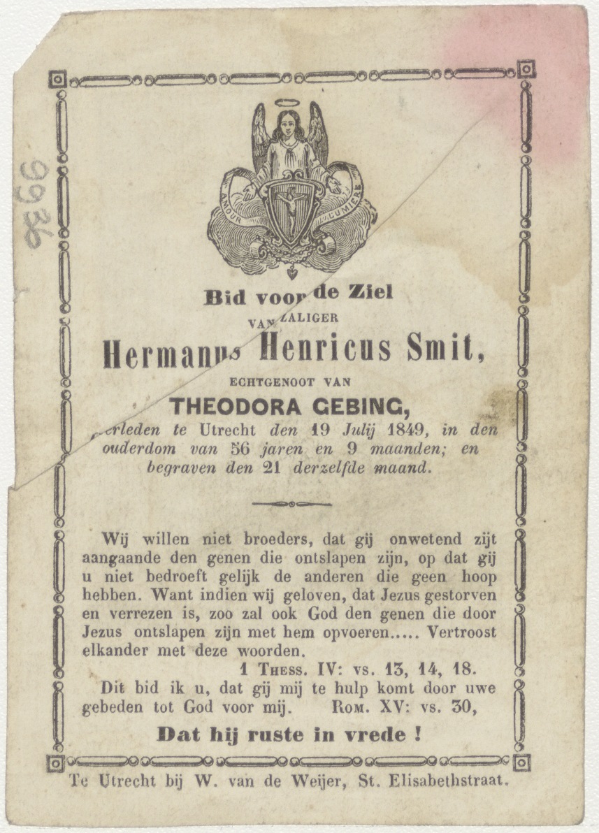 Gelijk alle menschen door Adam sterven... grafzerk met vrouw, kz. Bid voor ziel Smit-Gebing (+1849) Utrecht