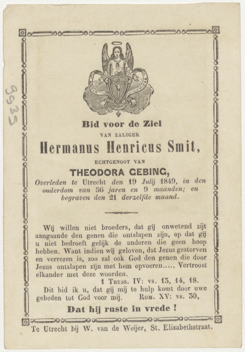 'Het is een heilig en zalig gepeis... grafzerk, kz. Bid voor ziel Smit-Gebing (+1849) Utrecht