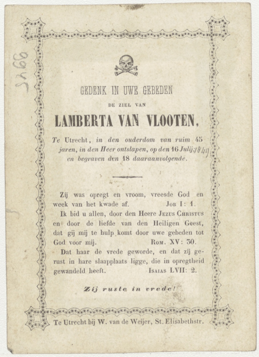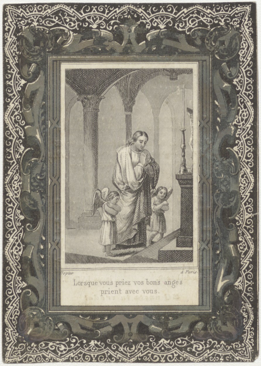 Priester voor altaar met twee engelen (Frans), kz. Bid voor ziel Van Vlooten (+1849) Utrecht