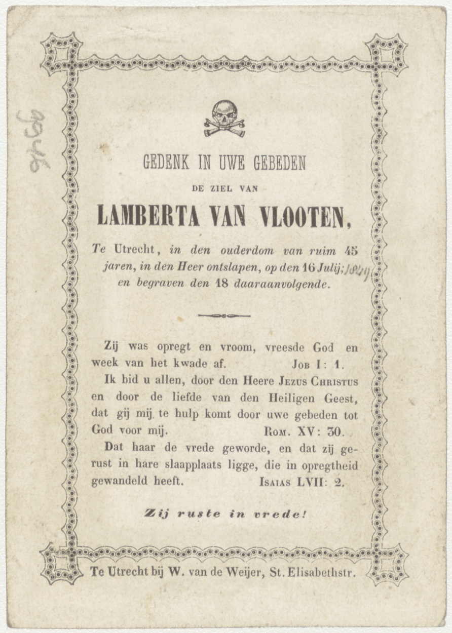 Alziend oog met twee engelen, kz. Bid voor ziel Van Vlooten (+1849) Utrecht