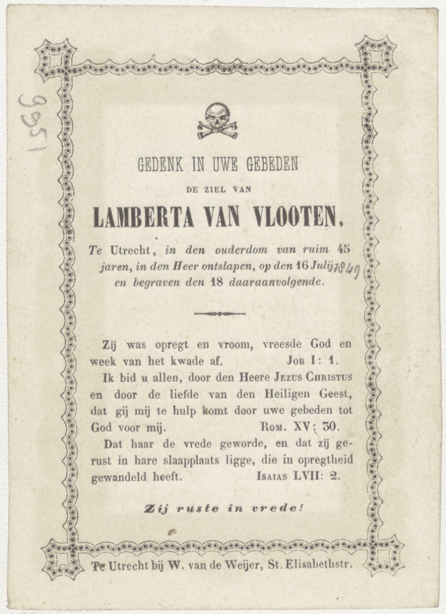 Priester met twee engelen voor altaar (Frans), kz. Bid voor ziel Van Vlooten (+1849) Utrecht