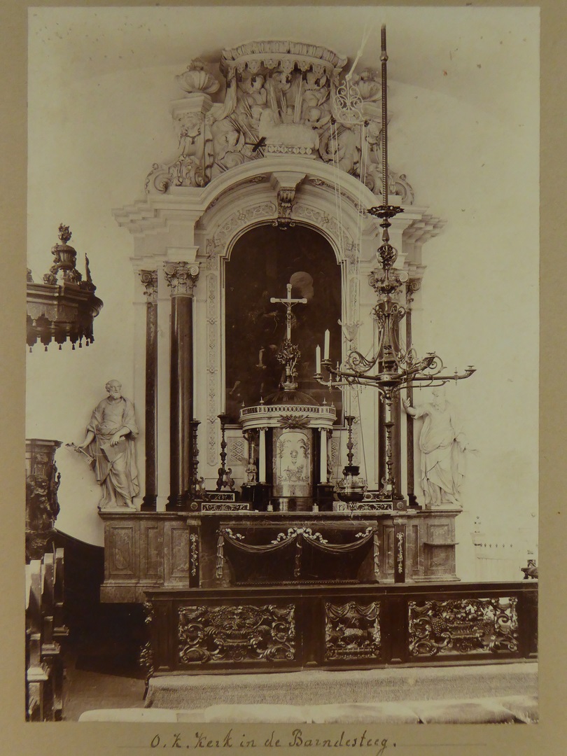 Amsterdam, interieur oud-katholieke kerk in de Barndesteeg, zicht op het altaar