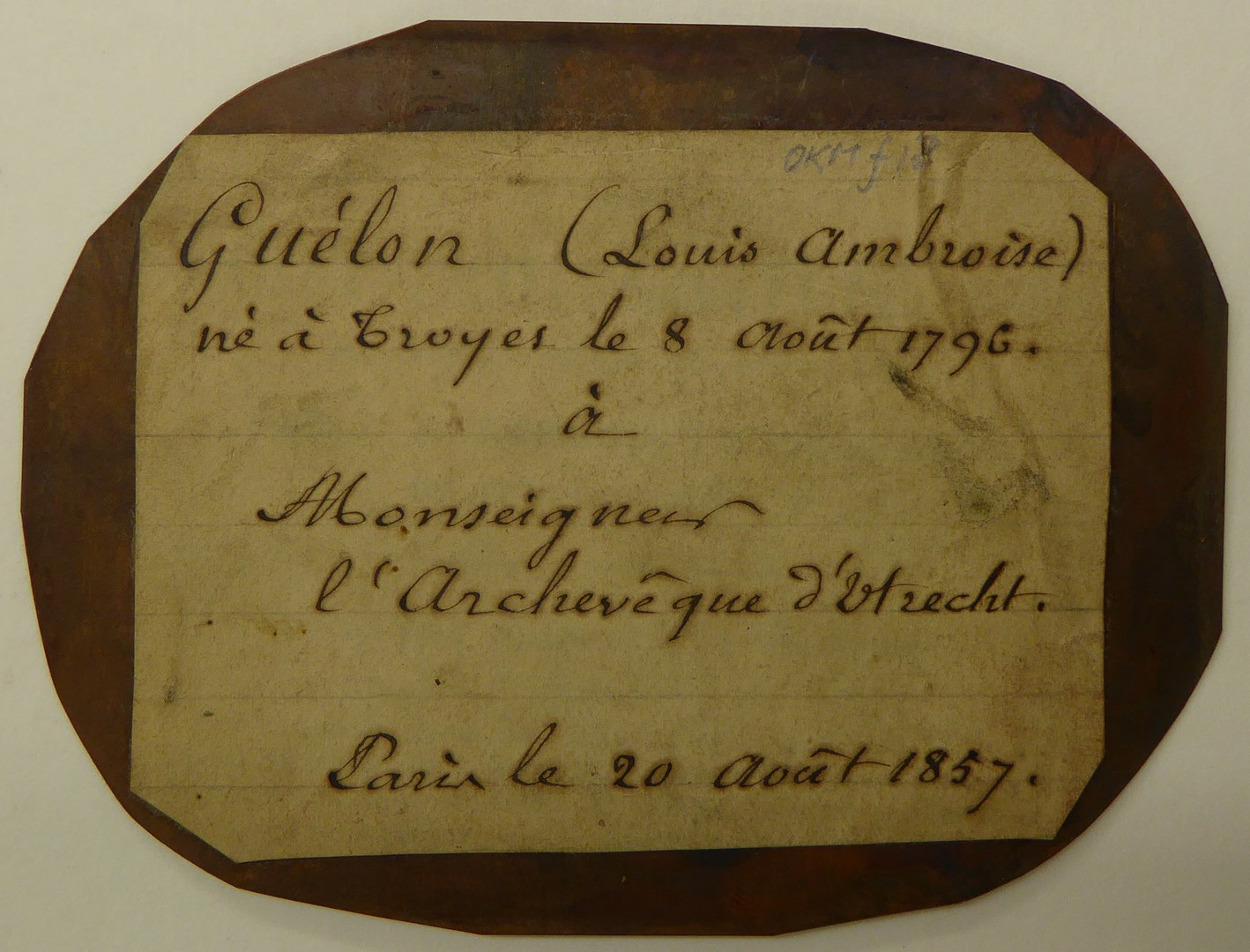 Portret (vrijwel verdwenen) van Louis-Ambroise Guélon, met op keerzijde "... né à Troyes le 8 aout 1796 à Mgr. l'Archevêque d'Utrecht ..."