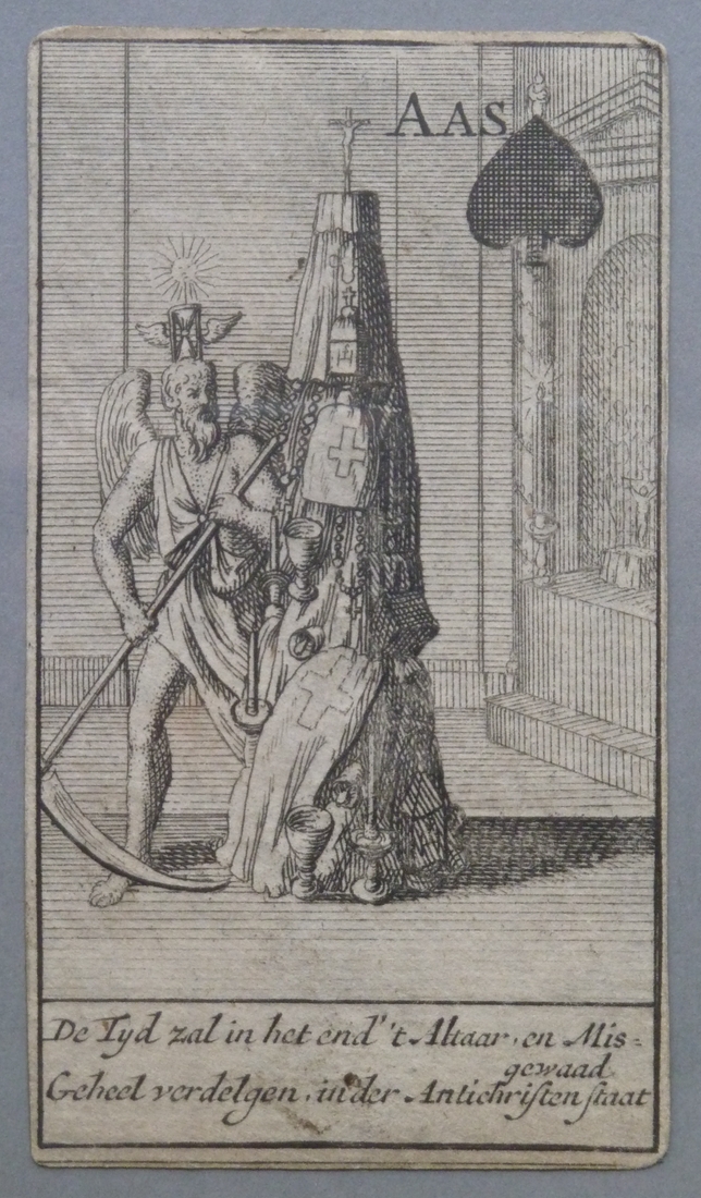 Kaartspel: Schoppen aas; De Tijd zal in het end 't altaar en misgewaad geheel verdelgen, ...