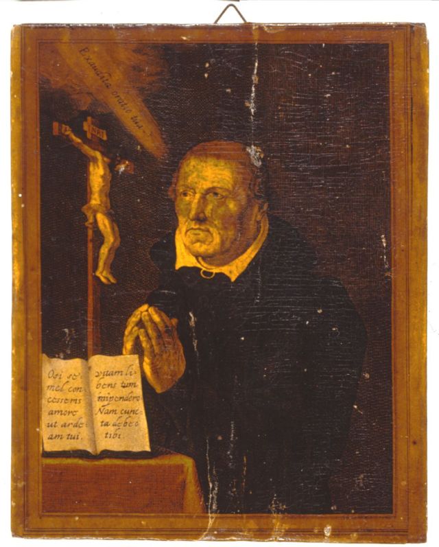 Portret van Cornelius Musius (1500-1572), ingekleurd en op hout geplakt