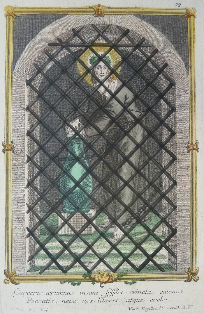 Christus aan de geselpaal achter een getralied boogvenster, ingekleurd