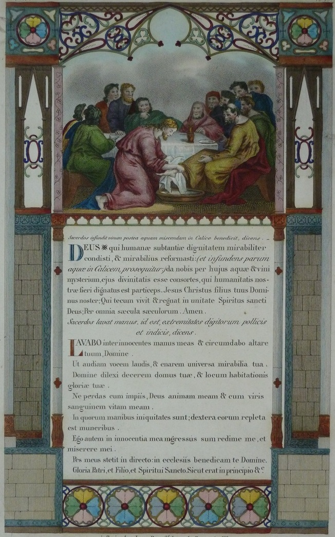 Latijnse tekst in neogotisch kader met voetwassing door Christus tijdens laatste avondmaal